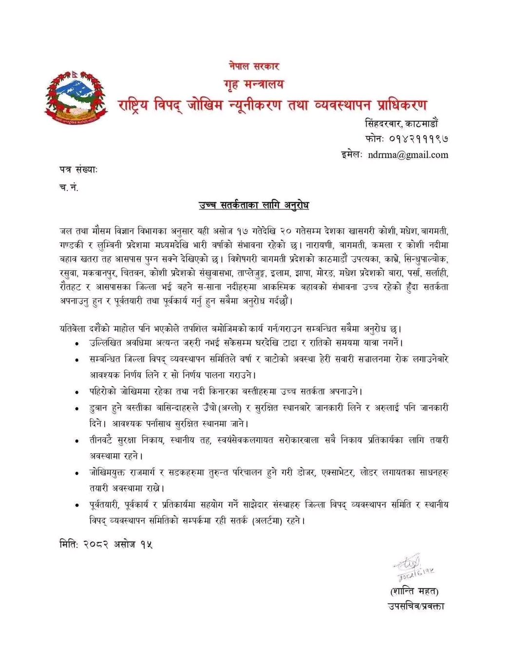 जल तथा मौसम विज्ञान विभागका अनुसार बिहीबारदेखि २० गतेसम्म देशका खासगरी कोशी, मधेश, बागमती, गण्डकी र लुम्बिनी प्रदेशमा भारी वर्षाको सम्भावना छ। प्राधिकरणले भारी वर्षाका कारण हुन सक्ने सम्भावित जोखिमबाट बच्न सबैलाई उच्च सतर्कताका लागि आग्रह गरेको हो।