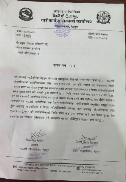 यहाँ रहेको बेस क्याम्पले आठराई र फेदाप गाउँपालिका क्षेत्रमा शान्ति सुरक्षा प्रदान गर्दै आएको थियो। आइतबार आठराई गाउँपालिकाका अध्यक्ष दिलकुमार पाहिम र फेदाप गाउँपालिकाका अध्यक्ष केशव भेटुवालले संयुक्त हस्ताक्षरसहितको ज्ञापन पत्र बुझाउँदै प्रमुख जिल्ला अधिकारीको ध्यानाकर्षण गराएका हुन्।