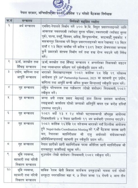 मन्त्रिपरिषद्को कात्तिक २४ गतेको बैठकका निर्णयहरू सार्वजनिक गर्न आयोजित पत्रकार सम्मेलनमा नेपाल सरकारका प्रवक्ता तथा सञ्चार तथा सूचना प्रविधिमन्त्री जगदीश खरेलले सो जानकारी दिए।