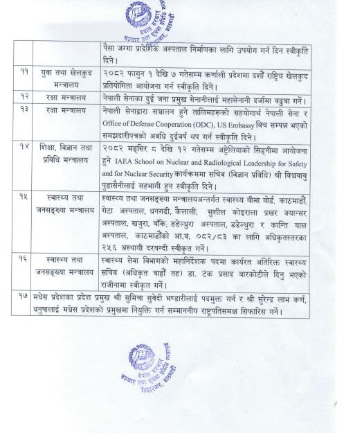 त्यसैगरी मङ्सिर ८ देखि १२ गतेसम्म अष्ट्रेलियाको सिड्नीमा आयोजना हुने ‘आइएइए स्कुल अन न्युक्लियर एन्ड रेडियोलोजिकल लिडरसिप फर सेफ्टी एन्ड फर न्युक्लियर सेक्युरिटी’ कार्यक्रममा विज्ञान तथा प्रविधि सचिव विश्वबन्धु पुडासैनीलाई सहभागी हुन स्वीकृति दिइएको छ।