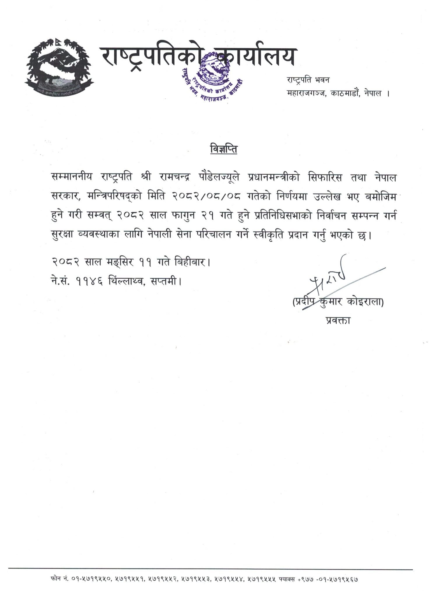 निर्वाचनका क्रममा सुरक्षा व्यवस्था सुदृढ गर्न नेपाली सेना परिचालन गर्ने प्रस्तावलाई राष्ट्रपति पौडेलले स्वीकृति दिएका हुन् ।
