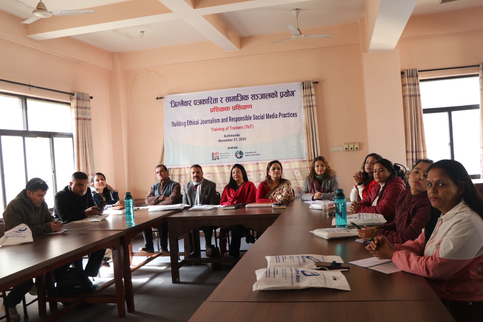 काठमाडौं । सामाजिक सञ्जालमा बढ्दो मिथ्या सूचना र सञ्चारमाध्यमको विश्वसनीयतामाथि प्रश्न उठिरहेको बेला अन्तर्राष्ट्रिय पत्रकार महासंघ र नेपाल पत्रकार महासंघले “जिम्मेवार पत्रकारिता र सामाजिक सञ्जालको प्रयोग” विषयक एकदिने प्रशिक्षक प्रशिक्षण तालिम आयोजना गरेका छन् । तालिममा महासंघ केन्द्रीय समितिका पदाधिकारी तथा सदस्य गरी २५ जना सहभागी थिए ।
