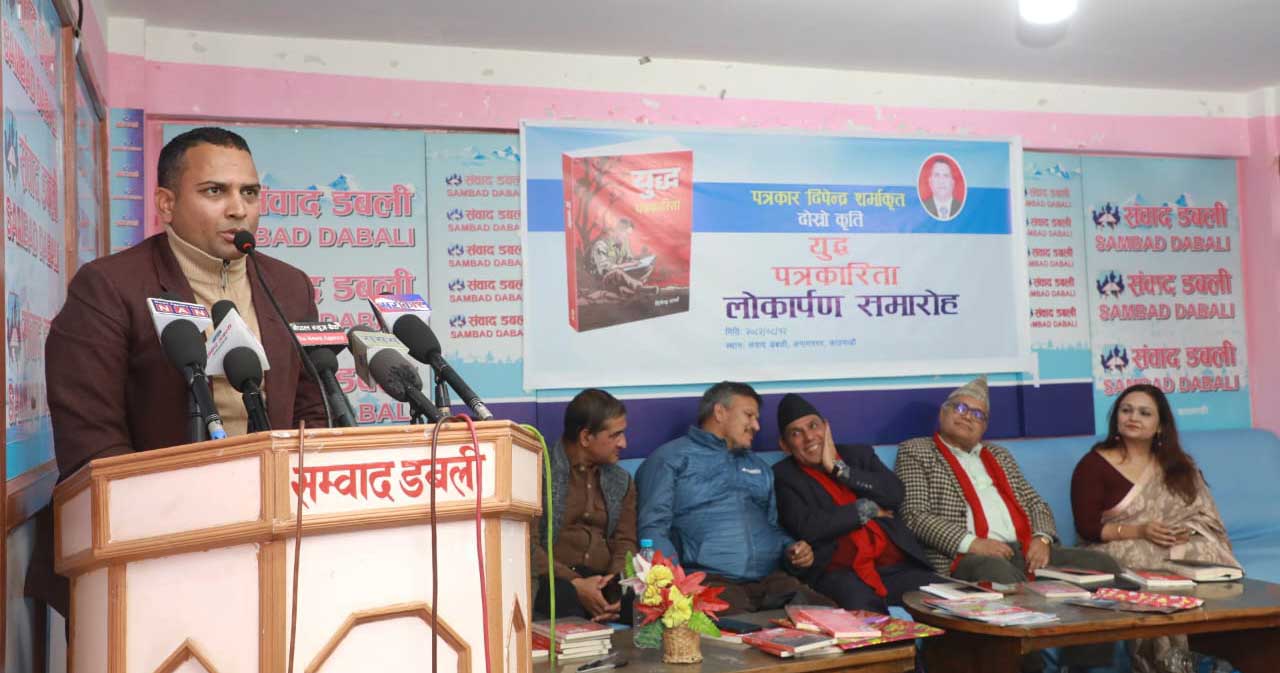 काठमाडौं । पत्रकार दिपेन्द्र शर्माको ‘युद्ध पत्रकारिता’ सार्वजनिक भएको छ । शुक्रबार राजधानीको संवाद डबलीमा राष्ट्रिय सभाका अध्यक्ष नारायण प्रसाद दाहालले पुस्तक लोकार्पण गर्दै बारुद्ध र मसीको घोल नै युद्ध पत्रकारिता भएको बताए। दाहालले पुस्तकमाथि समिक्षा गर्दै पुस्तकले जनयुद्धमा जनपत्रकारहरुले खेलेको भूमिका साहसिक र अतुलनिय रहेको बताएका छन् ।